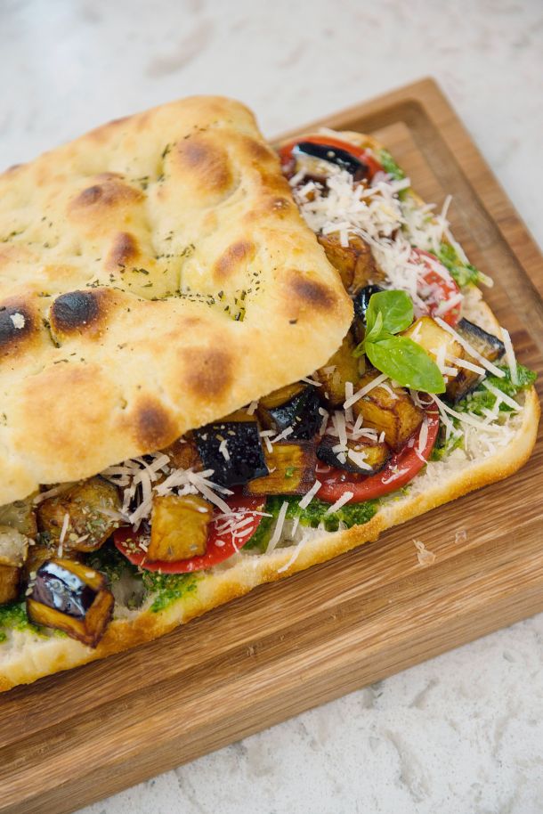 Faites toaster le pain puis ajoutez l'aubergine, les tomates, le pesto et filochez la mozzarella.